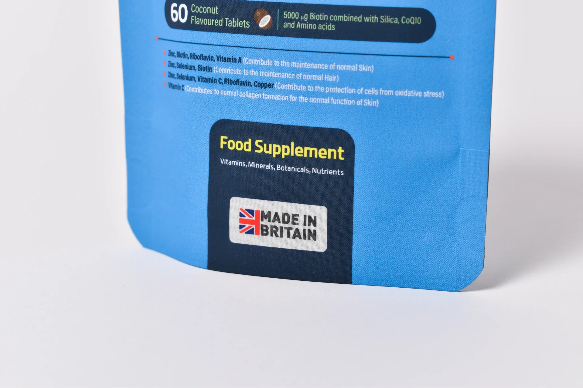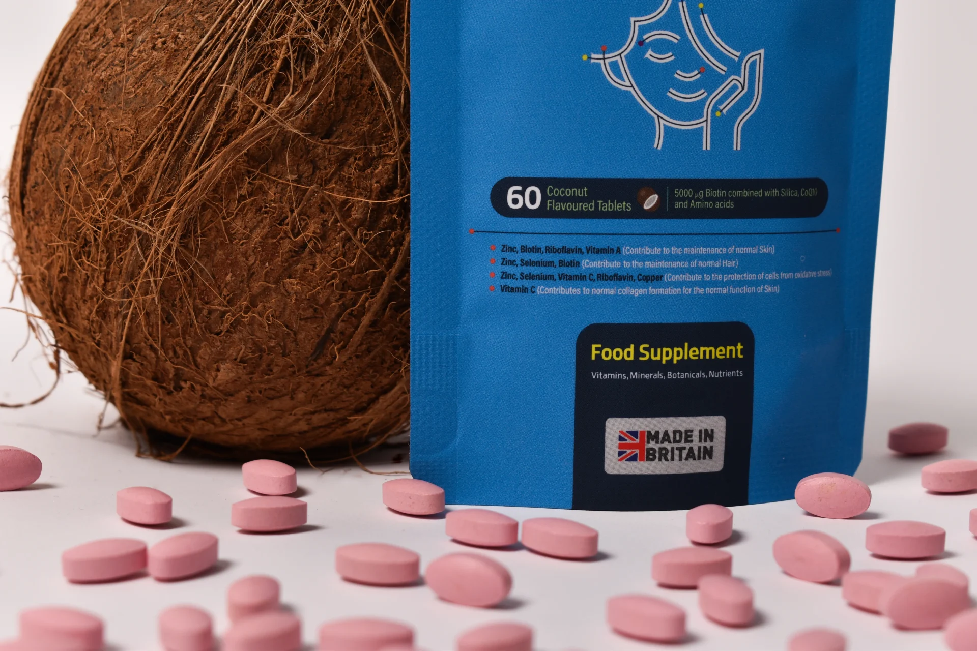 Bulking Agents (Microcrystalline Cellulose, Dicalcium Phosphate), Vitamin C (Ascorbic Acid), L-Arginine Hydrochloride, Zinc Oxide, Tablet Coating (Hydroxypropyl Methylcellulose, Polydextrose, Titanium Dioxide, Talc, Maltodextrin, Medium Chain Triglycerides, Carmine, Riboflavin), Vitamin B1 (Thiamine Mononitrate), Bamboo Extract (Bambusa Vulgaris), L-Cysteine Hydrochloride, Vitamin B5 (Calcium D-Pantothenate), Vitamin B3 (Nicotinamide), Vitamin D3 (Cholecalciferol), Coconut Flavour (Natural), Para Amino Benzoic Acid, Co Enzyme Q10 (Ubiquinone), Anti-caking Agents (Stearic Acid*, Magnesium Stearate*), Copper Gluconate, Vitamin B6 (Pyridoxine HCL), Vitamin A Acetate, Vitamin B2 (Riboflavin), Vitamin B7 (D-Biotin), Folic Acid, Selenium (Sodium Selenate), Vitamin B12 (Cyanocobalamin).